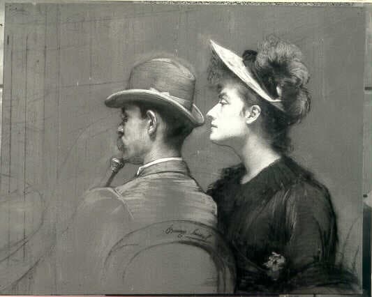 représentation humaine, scène de genre, spectacle, homme, femme, chapeau, canne, assis(e)