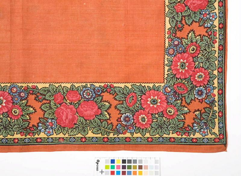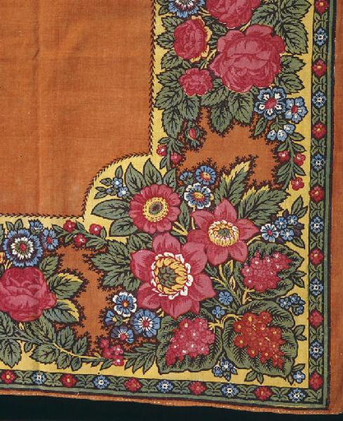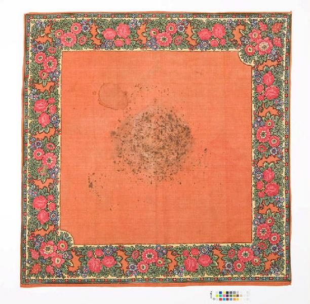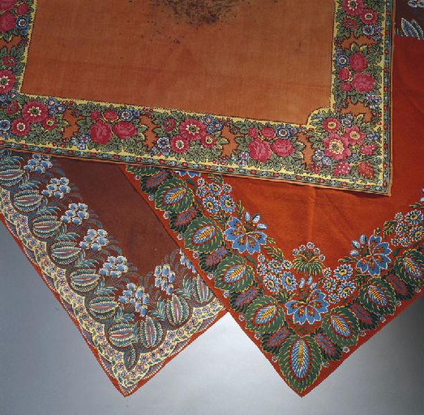 Fichu ou mouchoir de cou en toile de coton imprimée à la planche de bois. Le centre présente un fond uni brun orangé autour duquel se détache une large bordure végétale sur fond jaune délimitée au bord par un petit galon noir décoré de fleurs et feuilles stylisées. La bordure est composée par une végétation luxuriante de roses, anémones, oeillets, pensées, fleurettes et feuillages verts représentés avec précision tandis que, dans deux angles opposés, un bouquet est placé pour mettre en valeur la pointe. La qualité de l'impression, la variété des fleurs et la vivacité des coloris suggèrent une fabrication alsacienne vers 1810-1820