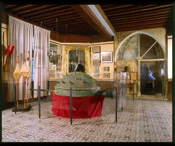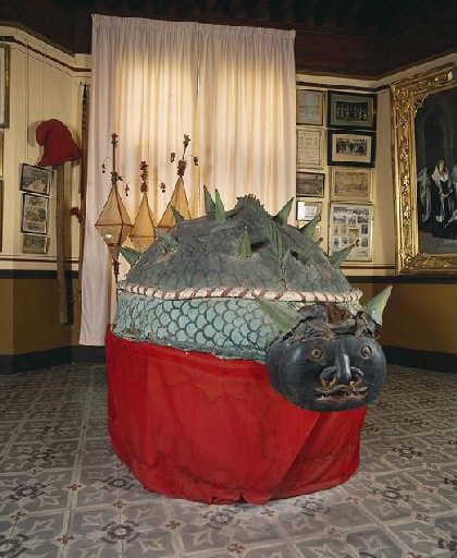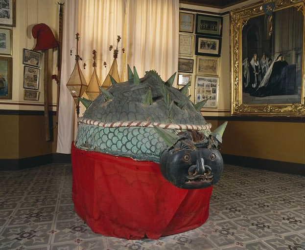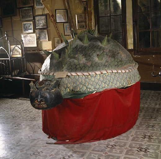 Etait portée par des hommes qui se glissaient sous la carapace lors des processions qui avaient lieu deux fois par an. La restauration effectuée en 2001 a révélé des interventions et des modifications sur la structure et l'apparence de l'effigie : à l'origine, celle-ci elle était rouge (carapace) et verte (tête) comme sur les gravures qui la représentent. Le tissu qui tombait autour d'elle était vert foncé (il est actuellement rouge). Elle n'avait pas de bourrelet mais une bande circulaire peinte, rayée de rouge et de blanc, bordée de noir en bas et de jaune vif en haut. Elle avait bien une crête dorsale mais peut-être pas de piquants. Ces éléments témoignent de la longue utilisation de cette tarasque processionnelle. Selon la tradition orale, la Tarasque, monstre amphibie et dévoreur, terrorisait la population d'une cité qui prendra son nom : Tarascon. Les plus anciennes sources écrites datent du 12e siècle. La Tarasque, créature hybride, aurait été vaincue et domestiquée par la sainte marthe venue de Béthanie après la mort de Jésus pour évangéliser la population provençale. Cette histoire unissant une ville à un animal monstrueux et un saint libérateur n'est pas exclusivement provençale. En effet, en France, on dénombre près de 40 villes liées à un dragon. Symbole de la maîtrise urbaine sur la nature hostile, leur domestication ou leur destruction par un saint saurochtone (tueur de dragons) et civilisateur exprime aussi le passage du paganisme au christianisme, commémoré lors de processions à caractère religieux et profane au cours desquelles les habitants se rassemblent autour d'une représentation de la bête vaincue. Ces effigies naissent pour la plupart vers la fin du XIIe - début XIII e siècle, à une époque où la cité médiévale est en plein essor. A Tarascon, les fêtes de la Tarasque doivent leurs statuts au roi René : le 14 avril 1474, celui-ci institue les ' Jeux et courses de la Tarasque '. Le lundi de Pentecôte et le 29 juillet , une procession singulière à laquelle se mêle une foule en liesse, associe alors un mannequin figurant la bête accompagnée de chevaliers, les chevaliers tarascaïres, à une jeune fille figurant sainte Marthe. On attribue également au roi René la forme définitive de l'effigie ' Un monstre à tête de lion avec crinière noire, carapace de tortue, armée de crocs et de dards : dents de lézard, ventre de poisson, queue de reptile, jetant par les naseaux de longues traînées d'étincelles produites par des fusées et à l'intérieur six hommes pour la porter '. Ces jeux, courses et processions autour de la Tarasque se sont imposés au XIXe siècle comme un sujet majeur de l'ethnographie de la Provence. L'intérêt était d'autant plus fort que ces réjouissances paraissaient en voie d'extinction : les courses du lundi de Pentecôte, annuelles avant la Révolution, n'eurent lieu qu'en 1846, 1861, 1891 et étaient en train de subir des évolutions notables. Aussi en 1896, Frédéric Mistral s'est attaché à réunir les objets éclairant la légende, les rituels et à collecter l'iconographie la plus large possible de sainte Marthe et de la Tarasque. La pertinence de la collecte mistralienne vient en grande partie de la connaissance qu'avait le poète de ces fêtes auxquelles il avait dû participer enfant. Elle s'explique aussi par ses lectures, notamment celle du poème en vers de J. Desanat dont il reprendra certaines notations. Dès 1859, Frédéric Mistral avait fait résonner, dans le chant IX de Mireille, les chansons qui accompagnaient l'effigie tourbillonnante de la Tarasque : ' Ah ! quand courait l'antique sorcière, lagadigadeou ! la Tarasque ! quand de danses, de cris, de joie et de vacarme s'enlumine la ville morne, nul qui fit en Condamine, mieux que lui ou de meilleure grâce, voltiger dans les airs la pique et le drapeau '. Plus tard, en 1861, il avait même consacré tout un article à ces fêtes, paru en 1862 dans ' l'Armana Prouvençau ', article fortement marqué par le texte de J. Desagnat, mais d'une telle préc ision qu'il inscrit au répertoire des sources littéraires ce fait ethnographique. Devenue identitaire, cette fête, célébrée encore aujourd'hui, a inspiré de nombreuses représentations iconographiques savantes ou populaires qui aiguisent l'imaginaire. La Tarasque de Tarascon est l'un des derniers dragons rituels d'Europe. ; - Dossier pédagogique de l'Action culturelle Selon une légende qui s'élabore au XIIème siècle, ce montre réminin qui dévorait la population de Tarascon et des environs, est maîtrisé par sainte Marthe, soeur de sainte Marie-Madeleine. Toutes deux, ainsi que leur frère Lazare (le réssuscité) comptent parmi les premiers évangélisateurs du midi de la France. Marthe fascine la Tarasque grâce au crucifix et à l'eau bénite qu'elle porte, puis lui passe sa ceinture autour du cou. Ce geste d'exorcisme débarrasse la poulation des vieux démons païens qui hantaient les esprits et fait 'place nette' au christianisme. Afin de commémorer la libération de la ville et la conversion de ses habitants, le 29 juillet, jour de la sainte-Marthe, un simulacre de bois et de carton, est promené, tenu en laisse par une jeune vierge assistée de 'Tarascaires' (porteurs). Le simulacre présenté dans la salle des Rites et Légendes du museon Arlaten a certainement appartenu à une confrérie
