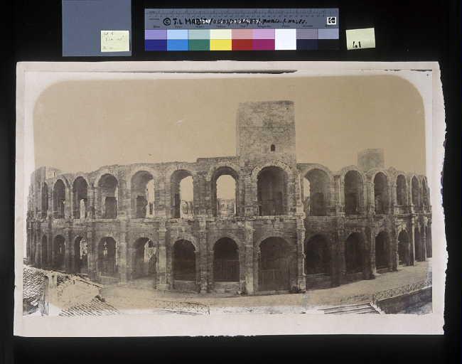 C'est au passé glorieux de la ville antique d'Arles, la 'Gallula Roma' que fait référence Dominique Roman quand il photographie l'amphithéâtre. Jusqu'au début du 19e siècle, l'extérieur du monument était encombré de masures, les arcades de la galerie du rez-de-chaussée servaient d'échoppes, d'écuries ou d'entrepôts. C'est surtout à partir de 1845 que le monument, pris en charge par l'administration des Monuments Historiques, retrouva son aspect ' originel '. Cette photographie panoramique est en réalité un habile montage de calotypes (négatifs sur papier ciré) décrit avec précision dans un compte-rendu de l'Exposition Universelle de 1867 (Le Moniteur de la Photographie, n°13, 15 septembre 1867). ' Cette vue est d'autant plus remarquable qu'elle est formée de plusieurs clichés sur papier ciré sec obtenus successivement avec une chambre noire ordinaire, et tirés séparément sur papier albuminé d'une seule pièce. L'auteur se sert d'un châssis positif aux deux extrémités duquel sont adaptées deux boîtes pour renfermer le papier et le conserver à l'abri de la lumière pendant l'impression. ' Ainsi, l'artiste ne se contente pas de tirer ses négatifs, il construit ses images à partir de montages élaborés, sans tenir compte de la réalité optique. Ce panorama de l'amphithéâtre présente une vue bien singulière, à plusieurs perspectives, qu'il n'est possible d'obtenir qu'en déplaçant l'appareil de prise de vue. Tout l'art de Dominique Roman réside ici dans le fait que les déformations dues à cette technique sont assez peu perceptibles