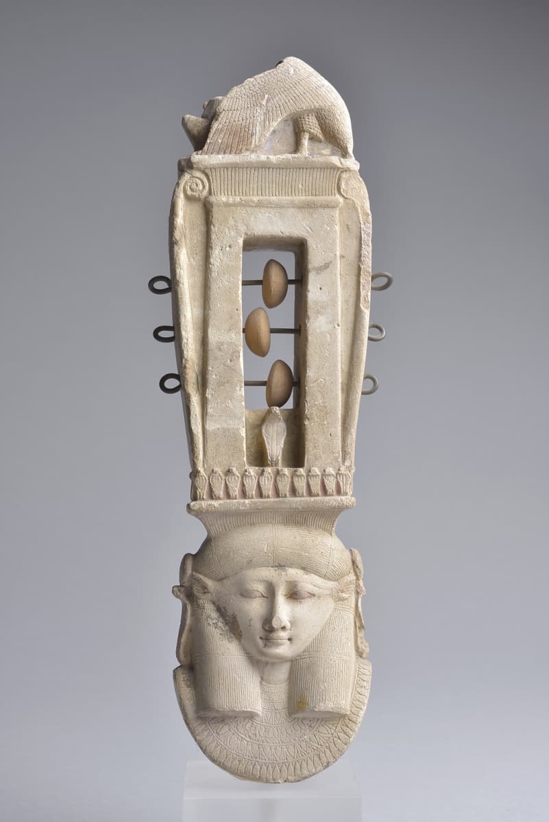 Terre cuite glaçurée. ; Ce sistre votif adopte la forme d'une colonne hathorique. Sa poignée prend la forme d'une tête biface de la déesse Hathor : un visage humain avec des oreilles de vache, coiffé d'une perruque à deux mèches retombant sur le front, et paré d'un grand collier-ousekh autour du cou. De chaque côté de la perruque, un cobra dressé avec un disque solaire émergeant au sommet du collier. Au-dessus de la tête de la déesse, un chapiteau à gorge surplombe un naos ouvert, orné d'une moulure à gorge et entouré à sa base de cobras sculptés, dont un, plus imposant, à l'intérieur de la chapelle. Cette structure est traversée par des tiges métalliques supportant des grelots en pierre qui résonnent lorsqu'on les agite. Les longues cornes sont enroulées près du sommet, proches de la moulure du naos. Au sommet, une sculpture en relief, partiellement fragmentée, représente un vautour avec des ailes déployées. Le sistre est un instrument de musique rituel utilisé dans le cadre des célébrations divines ou des rituels funéraires. Deux variantes principales sont répertoriées : le sistre naos et le sistre arqué. Le sistre naos fait son apparition dès la VIe dynastie et demeure en usage jusqu'au début de l'Époque Romaine. Fabriqué principalement en faïence, il semble avoir été davantage conçu comme une représentation votive. Quelle que soit sa conception, le sistre était utilisé par des femmes de haut rang telles que reines, princesses, adoratrices divines, chanteuses et musiciennes lors de cérémonies principalement dédiées à Hathor, dont il était le symbole. Le son produit par le sistre évoque le doux bruissement des papyrus dans les marécages, l'habitat de la vache sacrée. Ce son avait pour but de réjouir et d'apaiser la déesse, établissant ainsi une connexion symbolique avec son environnement sacré.