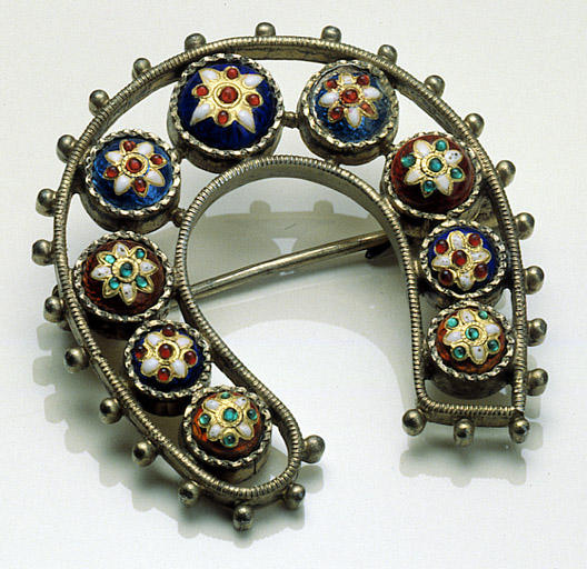 En forme de fer à cheval, broche porte bonheur composée de 9 médaillons émaillés ronds fixés par une corde crénelée à grains.