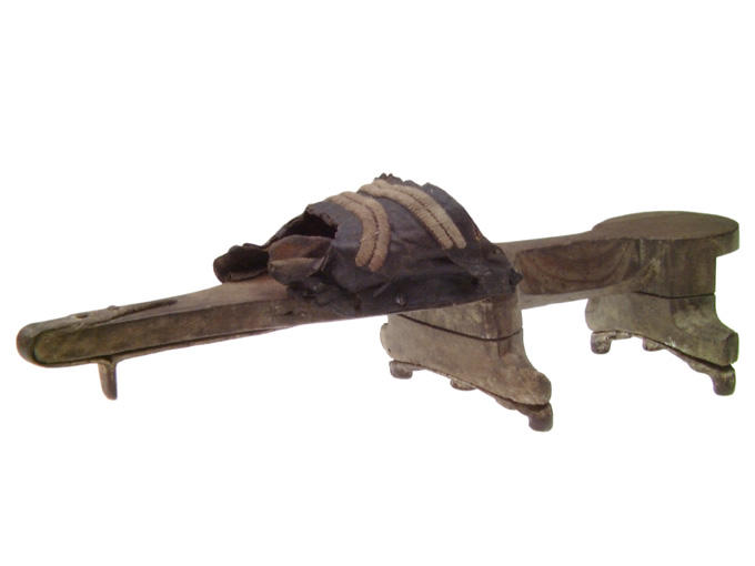 Bandeau de cuir brodé. Semelle en bois ferrée