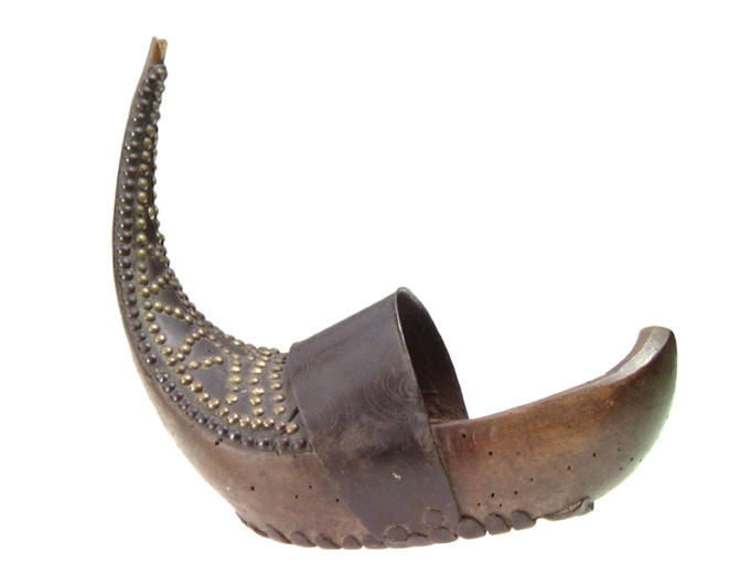 Sabots en bois d'une seule pièce originaire de la Vallée de Bethmale. Dessus entièrement décoré de clous cuivrés disposés en forme de coeur. Bout pointu très relevé. Bandeau de métal. Semelle ferrée.