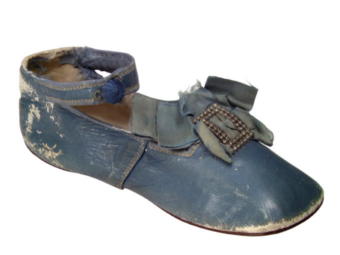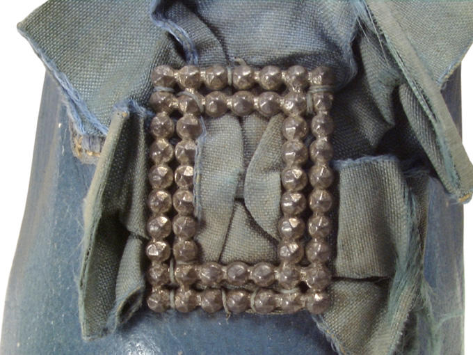 Chaussons d'enfant en chevreau bleu clair doublé de toile blanche. Bout carré arrondi. Bride boutonnée. Décor de noeud avec boucle en perles métalliques. Semelle plate en cuir