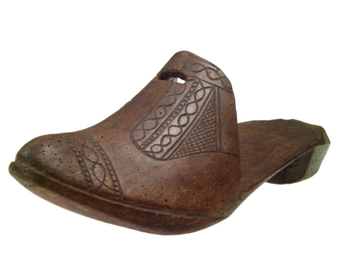 Sabot en bois utilisé comme étrier avec des motifs gravés. Petit talon.