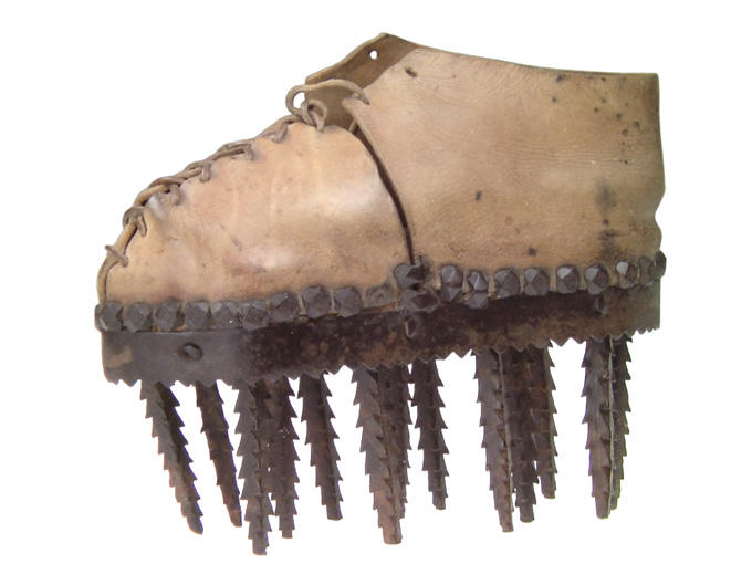 Brodequin à décortiquer les châtaignes. Dessus en cuir lacé. Semelle en bois renforcée de fer forgé.