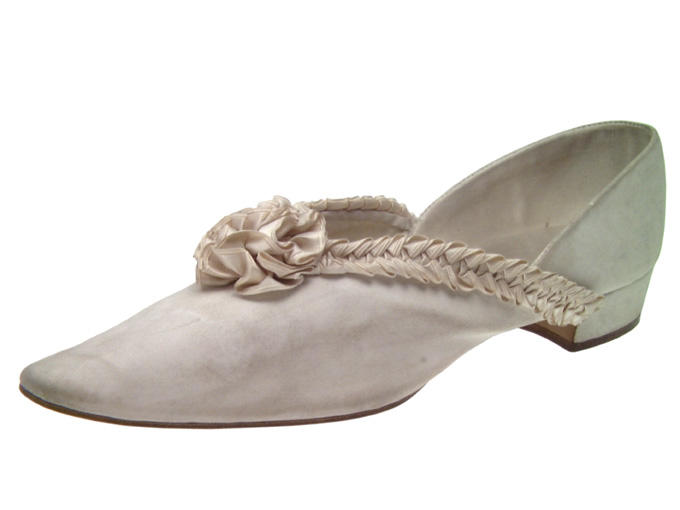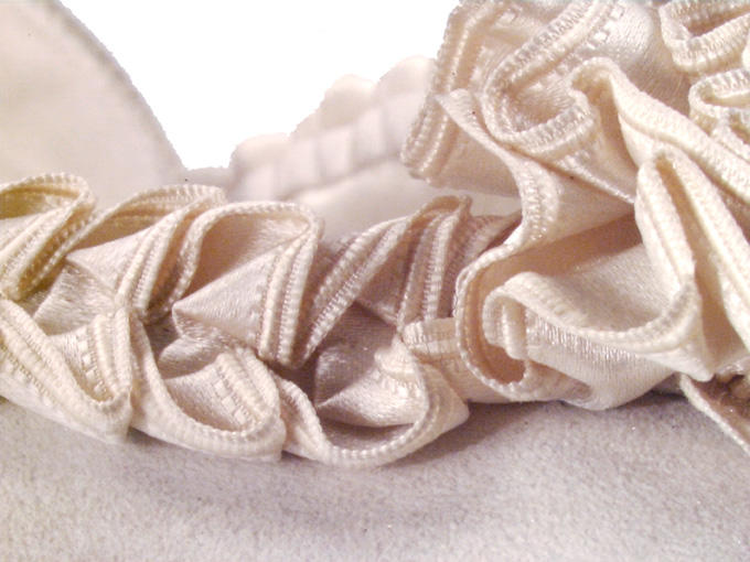 Chaussure de femme en daim blanc. Rosette et volant en satin crème. Talon anglais et semelle en cuir