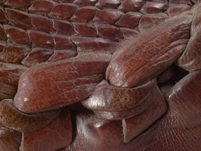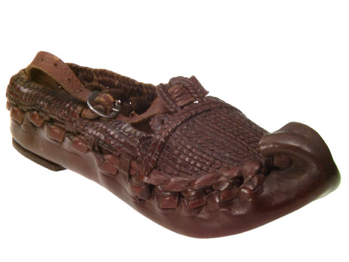 Mocassin de type opanque pour enfant en cuir marron. Plastron finement tressé. Brides et boucle sur le côté. Bout trompe. Petit talon chiquet.