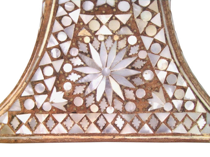 Socques de femme (assise horizontale) monobloc. Bois entièrement sculpté d'alvéoles aux contours variés dans lesquelles s'enchassent divers motifs de nacre. Filets de marquetterie cernant certains contours. Clous de laiton.