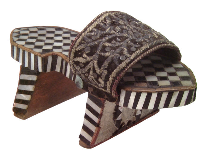 Socques de femme en bois incrusté de damiers en nacre et ébène. Tranche zébrée de barrettes alternées de même matière. Bandeau de tissu noir galonné et brodé de motifs de fils d'argent et de rondelles de clinquants.