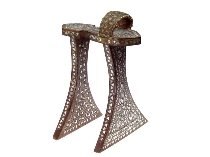 Socques de femme ou patin (assise horizontale) constitué de trois pièces de bois façonnées revêtues sur toutes leurs surfaces de fragments de nacre triangulaire disposés en alignement alternés ou en rosace. Cette mosaïque est rehaussée par des incrustations de fil de métal. Bandeau décoré de broderies.