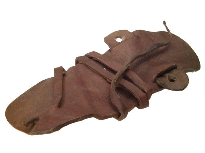 Sandales rudimentaire avec une simple semelle où une bride passant par deux fentes de la cambrure dégage deux oreillons. Ces attaches percées d'un trou permettent à une mince bande de cuir partant d'entre les deux orteils de maintenir la sandale au pied. Système on ne peut plus simple ni colle ni fil ni clou.