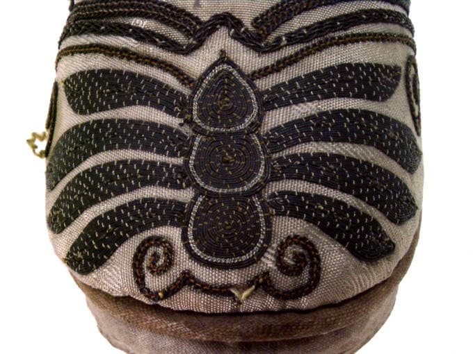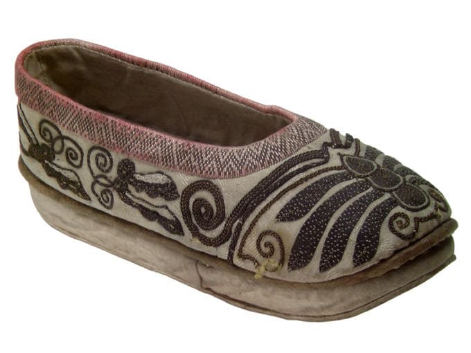 Chaussures d'enfant en satin beige brodé. épaisse semelle de papier doublée de cuir.