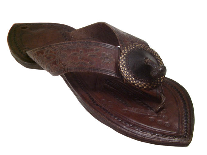 Sandales de femme en cuir finement gravé. Gros bouton ouvragé en décor