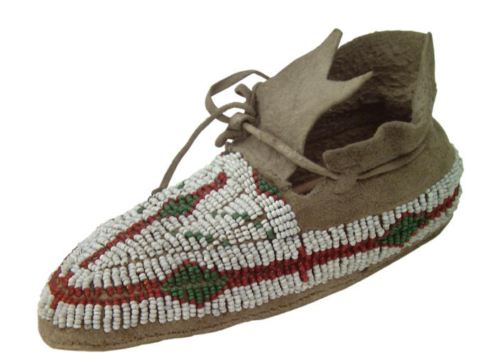 Mocassins indien (pour enfant Sioux) à semelle rapportée en peau beige entièrement perlée de motifs multicolores.