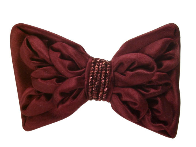 Noeud de chaussure pour femme. Noeud papillon en satin grenat avec bouillonné et perles en acier teinté.