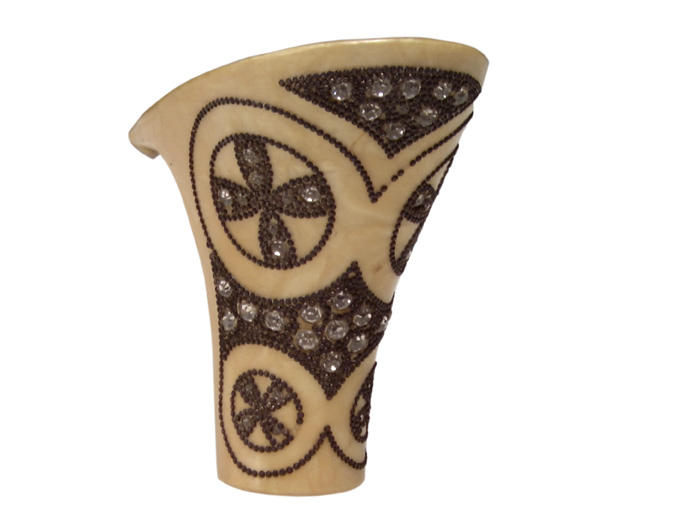 Talon de soirée en bois recouvert de celluloïd jaune nacré. Décor de strass et fines perles de métal formant un motif floral