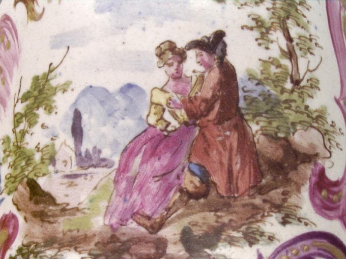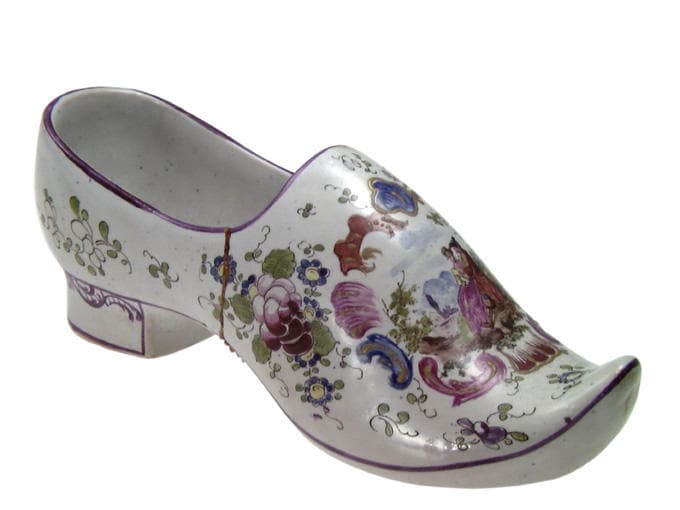 Sabot en faïence blanche peinte. Médaillon central avec deux personnages. Décor floral (quartier arrière). Bout relevé.