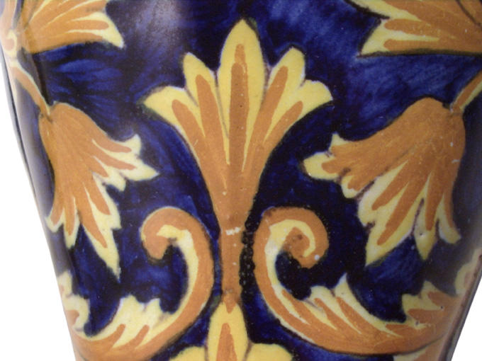 Chaussure de femme en faïence blanche peinte en bleu. Décor ocre. Bout très pointu.