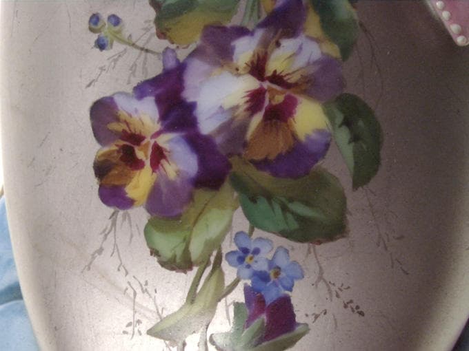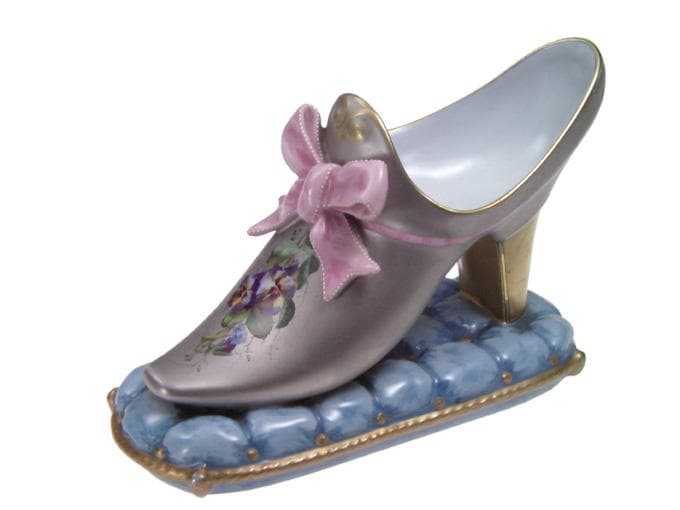 Mule de femme en porcelaine peinte en gris. Décor de pensées. Noeud rose en barbotine. Talon or. Socle en porcelaine bleu imitant un coussin.