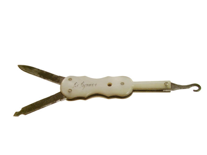Tire-boutons pour gants se présentant comme un canif. Petit crochant en acier, lames de couteau et lime à ongles repliables dans un fourreau de métal recouvert de nacre en forme de violon, et servant de manche à chacun des instruments. Prefix numbers (Buttonhook Society Archives) : 29 (Stanhope combination) N.B. Objet souvenir marqué. Le Havre en lettres gothiques et percé d'un petit trou circulaire destiné, à l'origine, à laissez voir une vue de l'endroit indiqué sur le manche.