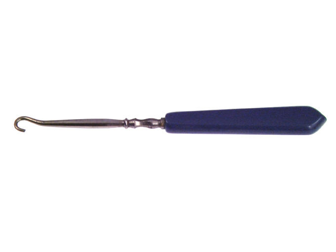 Tire-boutons pour bottines. Crochet en métal nickelé. Manche en galalithe bleue. Fonction: boutonnage des bottines. Prefix numbers (Buttonhook Society Archives) : 32 (Plastic defined)
