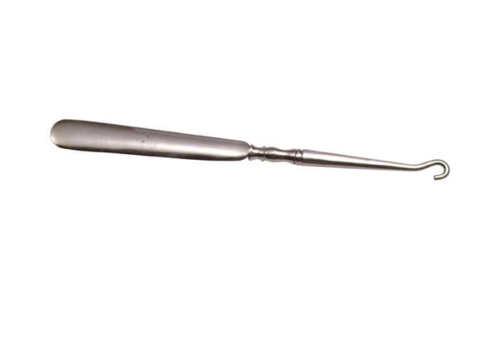 Tire-boutons pour bottines et tous usages, formé par une tige d'acier chromé. Partie crochet circulaire, partie manche applatie. Prefix numbers (Buttonhook Society Archives) : 36 (Plated chromium)