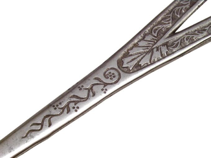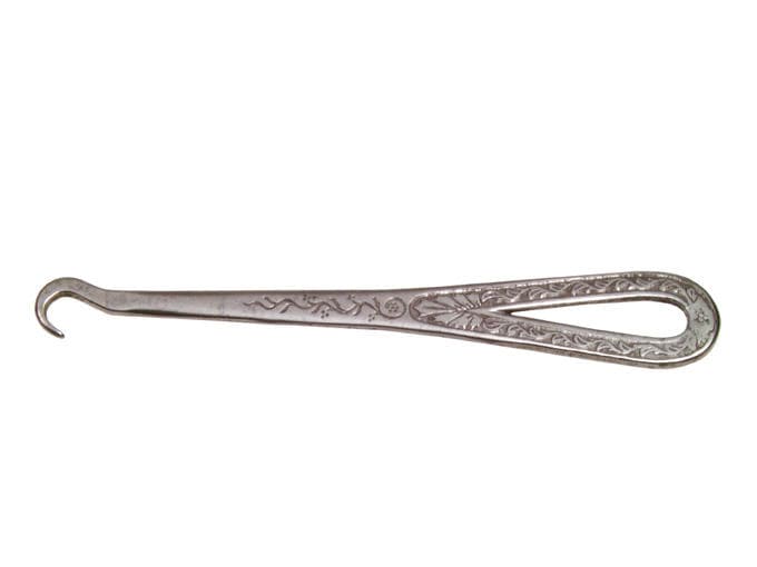 Tire-boutons pour gants en métal estampé et nickelé entièrement plat. Crochet s'élargissant en forme de goutte d'eau allongée, faisant office de manche. Prefix numbers (Buttonhook Society Archives) : 36 (Plated chromium)
