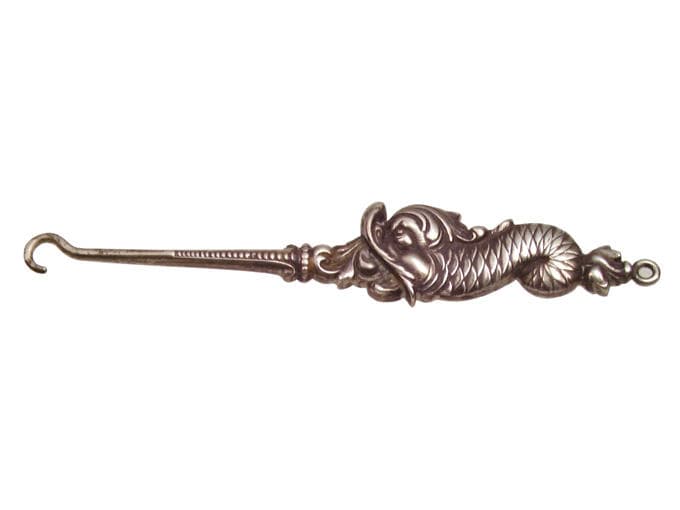 Tire-boutons pour gants en métal argenté. L'une des faces est plate marquée Sterling. L'autre est composée d'un manche en forme de poisson un peu monstrueux à large bouche d'où sort le crochet. Prefix numbers (Buttonhook Society Archives) : 38 (Plated silver)