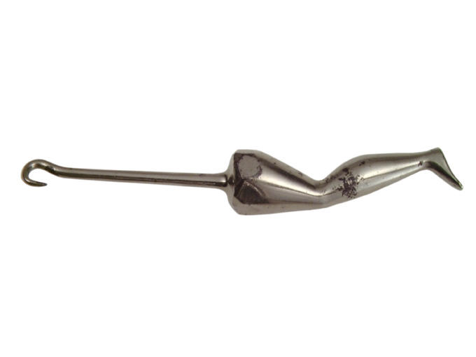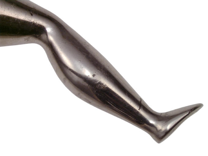 Tire-boutons droit fait d'une seule pièce de métal moulé et chromé. Crochet prolongé d'un manche en forme de jambe. Prefix numbers (Buttonhook Society Archives) : 62 (White Metal undefined - Sub-type: Novelty)