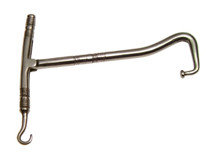 Tire-bottes en métal nickelé. Manche pliable avec tire-boutons à une de ses extrémités.