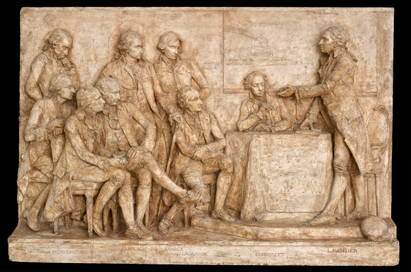 Sur la plinthe, de gauche à droite : VICQ D'AZIR / GUYTON DE MORVEAU / MONGE / BERTHOLLET / LAPLACE / LAMARCK / LAGRANGE / CONDORCET / LAVOISIER