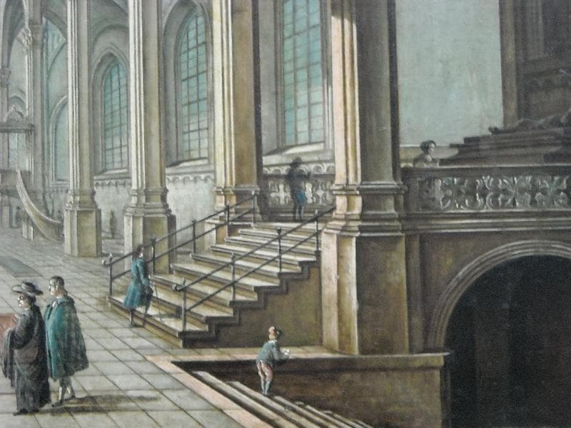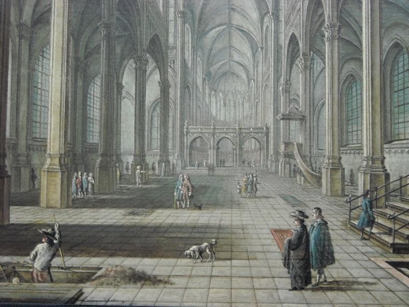 L'attribution actuelle de ce tableau donné auparavant à l'école française du 17e siècle est due à Monsieur J. Foucart. La peinture d'intérieurs d'églises apparut en Flandres vers 1570 avec Steenwick l'Ancien. Ce genre nouveau représente un aspect particulier de la peinture d'architectures, qui prend ses racines dans les réalisations perspectives imaginaires de Hans Vredeman de Vries (1527 - 1606). A côté des vues de villes, d'extérieurs de bâtiments, les intérieurs d'églises sont un type spécifique qui se développa à Anvers, Delft et Haarlem tout au long du 17e siècle. De nombreux peintres, flamands puis hollandais, se spécialisèrent dans ce genre, dont la vogue se répandit en Europe. Les architectures imaginaires de Vredeman de Vries, publiées dans des recueils d'estampes, servirent de source d'inspiration aux peintres d'architectures. Même les grands maîtres comme Dirck van Delen (1604/05 - 1671) utilisèrent ces estampes (Vermet, 1995, p. 33).