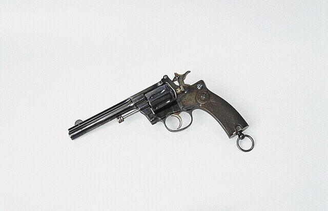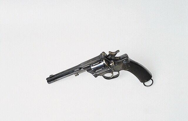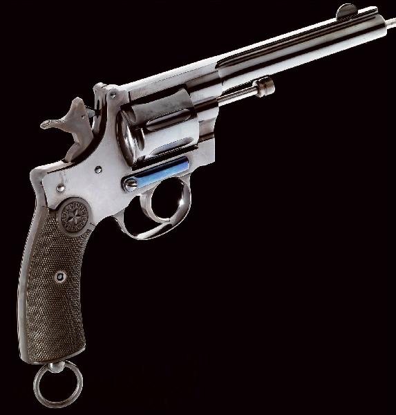 Revolver à percussion centrale modèle 1893 par H. Pieper à Liège, Belgique fin 19e siècle (Pieper Henry, né en 1840, mort en 1905, d'origine allemande, il s'installe en Belgique vers 1860. Il est fabricant à Liège en 1890. Maison à Paris. Brevets le 11 septembre 1890 pour un perfectionnement aux armes à barillet, le 20 février pour des améliorations apportées aux armes à feu...). Arme entièrement bronzée : canon rayé rond avec bande de visée surélevée portant un grain d'orge fixé par goupille. Le canon est marqué en dessous ' 3519 ' et porte sur le côté gauche (un sur le canon et l'autre sur la carcasse) 2 poinçons identiques ' B ' surmontés d'une étoile. Carcasse à cadre fermé, gravé sur le dessus ' H. PIEPER Bté LIEGE '. Bouton poussoir d'ouverture de barillet fixé sur le côté gauche, barillet alvéolé à 7 chambres, extracteur central mue par un ressort à spirale. La tranche arrière du barillet est marquée ' 3519', 'B ' surmonté d'une étoile et poinçon d'épreuve de Liège. Le barillet bascule sur le côté gauche pour le chargement. Plaquettes en matière plastique de couleur marron, moulées, quadrillées et marquées sur leur partie supérieure, dans un cercle ' H. PIEPER-PATENT- ' et au centre une étoile à 5 branches. Anneau de grenadière. Double action
