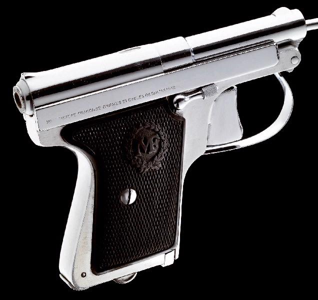 Pistolet semi automatique modèle Le Français modèle Type n° 917 fabriqué par la Manufacture Française d'Armes et Cycles de Saint-Etienne, années 1920. Avec sa boîte. Arme entièrement en duralumin poli blanc. Canon rond rayé en acier, crochet marqué à droite ' 917', à gauche du poinçon de l'épreuve de la MF et en dessous ' BREVETE S.G.D.G. / CAL.6.35 ' entouré de part et d'autre des poinçons dela manufacture. Glissière marquée en petites lettres, en bas à gauche ' MANUFACTURE FRANCAISE D'ARMES ET CYCLES DE SAINT-ETIENNE' et à gauche ' PISTOLET TYPE AVEC PIECES EN DURALUMIN / POIDS = 240 GR. ENV.', sur le dessus poinçon ' LE FRANCAIS ' dans un ovale. Plaquettes moulées marquées ' MF ' dans une couronne de lauriers. Chargeur amovible s'ouvrant par accrochage à l'arrière. La boîte porte une étiquette ' sans n°_ pistolet poche duralumin cal. 6.35 poids 240 grs. Prototype ' et rajouté au stylo bille de couleur bleu ' Matr 917 ' et au crayon de papier ' N°2 '