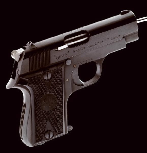 Pistolet semi-automatique modèle Unique C2 fabriqué par la Manufacture d'Armes des Pyrénées françaises, Hendaye, 20e siècle. Canon rond en acier poli blanc, marqué en dessous ' 32 '. Glissière en acier bronzé, marquée sur la gauche ' manufacture d'armes des Pyrénées Fses - HENDAYE - ' et à droite ' ' UNIQUE ' Mod/C2 - Cal. 7,65 - 7 coups '. échancrure de démontage et de sûreté usinée sur le côté gauche. Carcasse en acier bronzé, marquée à droite ' 512231', à gauche bouton de sûreté et de démontage. Plaquettes en plastique de couleur noire marquées dans un cercle ' UNIQUE '. Chargeur amovible marqué en dessous ' UNIQUE '. dans sa boîte en carton de couleur verte, portant la marque de fabrique dans un cercle doré au milieu duquel se trouve un lion debout tourné vers la gauche autour duquel il est écrit ' PISTOLET FRANCAIS UNIQUE '. (format : 152 x 110 x 30 mm) avec sa notice d'entretien dans sa pochette d'origine en papier transparent marquée ' PISTOLET ' UNIQUE ' ' et un écouvillon. Porte une étiquette collée sur le couvercle ' Matricule 512231 cal 7,65 '