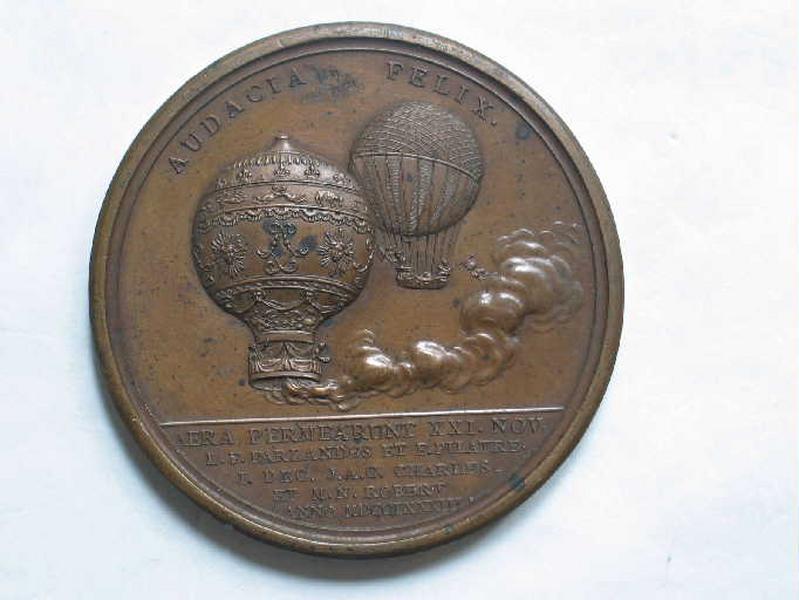 légende, avers : AUDACIA FELIX. AERA PERMAERUNT XXI. NOV L. F. DARLANDES ET F. PILATRE. I. DEC. J.A.C. CHARLES ET M.N. ROBERT ANNO MDCCLXXXIII ; légende, revers : PATEFACTO PER AERA ITINERE A JOSEPHO ET STEPHANO MONTGOLFIER V. JUNII MDCCLXXXIII. REI MEMORIAM POSTERITATI TRADI JUSSIT LUDOVICUS XVI. ANNO MDCCLXXXIV