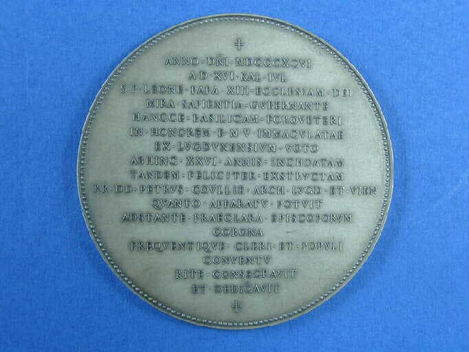 légende, avers : Anno Dei MDCCCXCVI A. D. Kal. Iul. S. P. Leone Papa XIII ...hanc basilicam ... RR. DD. Petrus Couillé arch.lugd. ..rite consecravit et dedicavit ; légende : Basilica in honorem B. M. V. Immaculata Foroveteri extracta ....