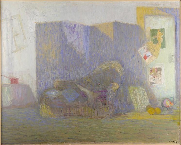 vue d'intérieur (atelier d'artiste, divan, paravent)