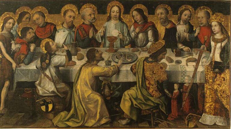 Les apôtres sont unis de part et d'autre d'une table rectangulaire couverte d'une nappe blanche à bandes bleues. Le Christ, seul personnage vu de face, soulève l'hostie qu'il bénit de la main droite; il vient d'annoncer la trahison de Judas. A proximité de lui, quatre disciples, dont saint Pierre (avec son glaive) et saint Jean, sont encore recueillis tandis que les 'grimaces' et les gestes des autres apôtres expriment déjà l'indignation ou la colère contenue. Trois disciples sont en face du Christ. L'un d'eux se retourne vers les trois donatrices. Un autre, saint Jacques, reconnaissable à son manteau de pèlerinage avec les coquilles et le chapelet, porte à ses lèvres un verre rempli de vin. Entre les deux, c'est le traître Judas. A l'extrémité droite de la table, sous les traits de sainte Catherine, l'artiste a représenté Jeanne de Mareschal, la femme du donateur Pierre Bonivard. On devine ce dernier agenouillé à côté de ses armoiries et présenté par saint Jean-Baptiste portant l'agneau nimbé