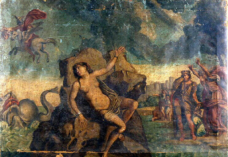 scène mythologique (Andromède : nudité, chaîne, rocher, Persée, Pégase, Méduse myth, dragon, Céphée, roi, Ethiopie, Cassiopée, couronne, douleur, bord de mer, fortification)