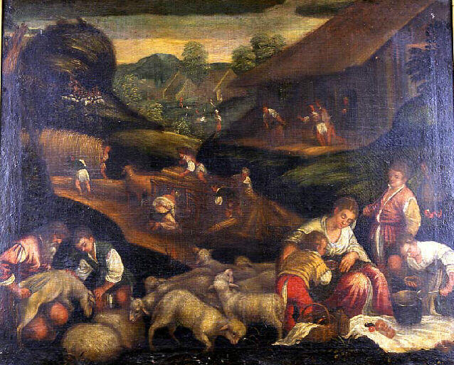 scène (paysan, fanage, mouton : tonte, foin, ramasser, voiture à attelage : boeuf, repas, écuelle, récipient pour la consommation, panier : vannerie, accessoire de la table) ; fond de paysage (champ, ferme)