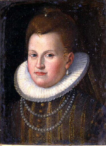 Portrait d'une femme en buste de trois-quarts à gauche. Ses cheveux tirés en arrière sont surmontés d'une petite coiffe en pointe, ornée sur le devant d'une perle et à laquelle est attaché un voile tombant à l'arrière. Elle porte des pendants d'oreille et un double collier de perles. Sa robe d'un gris-vert est ornée de bandes verticales dorées et est surmontée d'une fraise