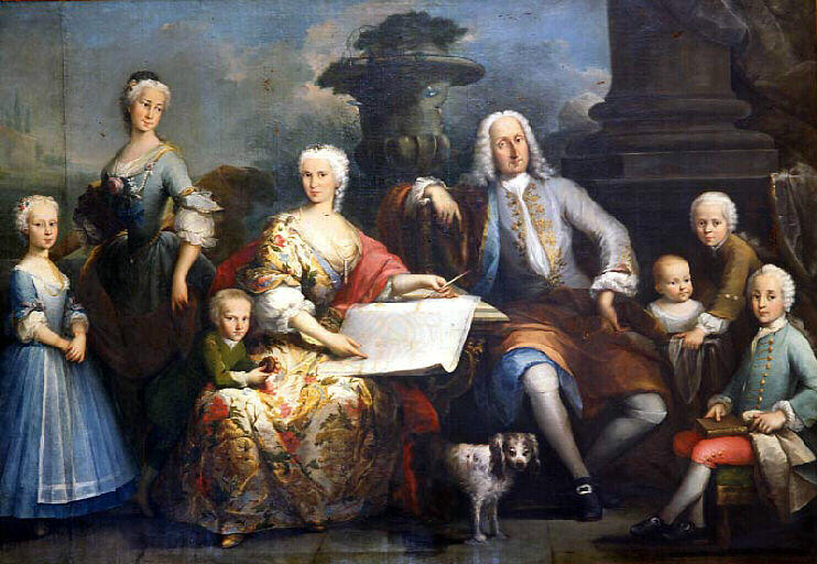Ce portrait de famille, installé sur une terrasse en plein air présente un couple d'aristocrate et leurs six enfants. L'épouse tient dans la main gauche la plume métallique grâce à laquelle le plan au sol de leur futur château a été dessiné. L'homme est assis sur la droite de la console rorcoco. Les deux filles et un garçon sont placés du côté de la mère, et les trois autres fils du côté du père. L'aîné, assis sur la droite, porte l'habit le plus raffiné des enfants et tient un livre sur ses genoux. Les personnages regardent le spectateur