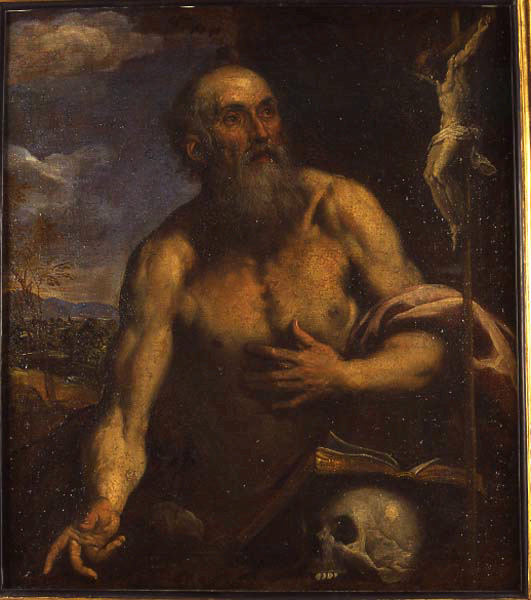 figure (saint Jérôme, Christ, homme, nudité, livre, crâne, barbe, crucifix)