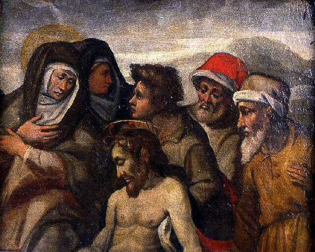 scène biblique (Descente de Croix, Christ, Vierge, saint Nicodème, saint Jean l'Evangéliste, saint Joseph d'Arimathie, coiffe)