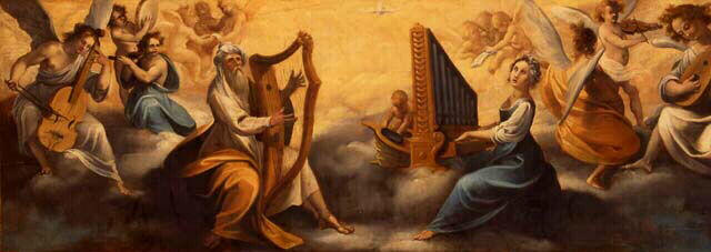 scène (David, sainte Cécile de Rome, ange, art de la musique, orgue, vielles, harpe, dans les airs, nuage)