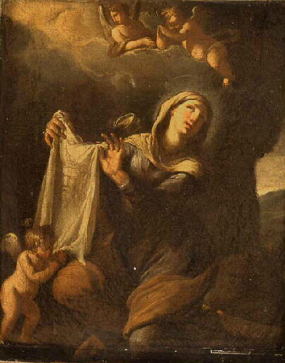 figure biblique (sainte Véronique, femme, de trois-quarts, à mi-corps, présentation : Sainte Face, ange, reliques)