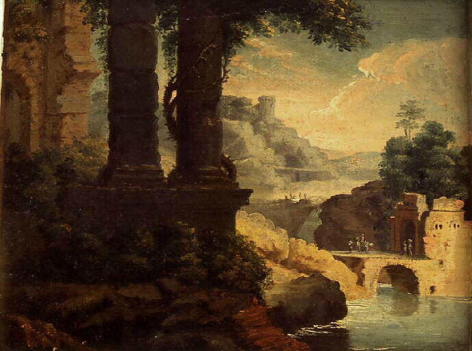 paysage (pont, arbre, architecture, ruines, rivière, château, personnage)